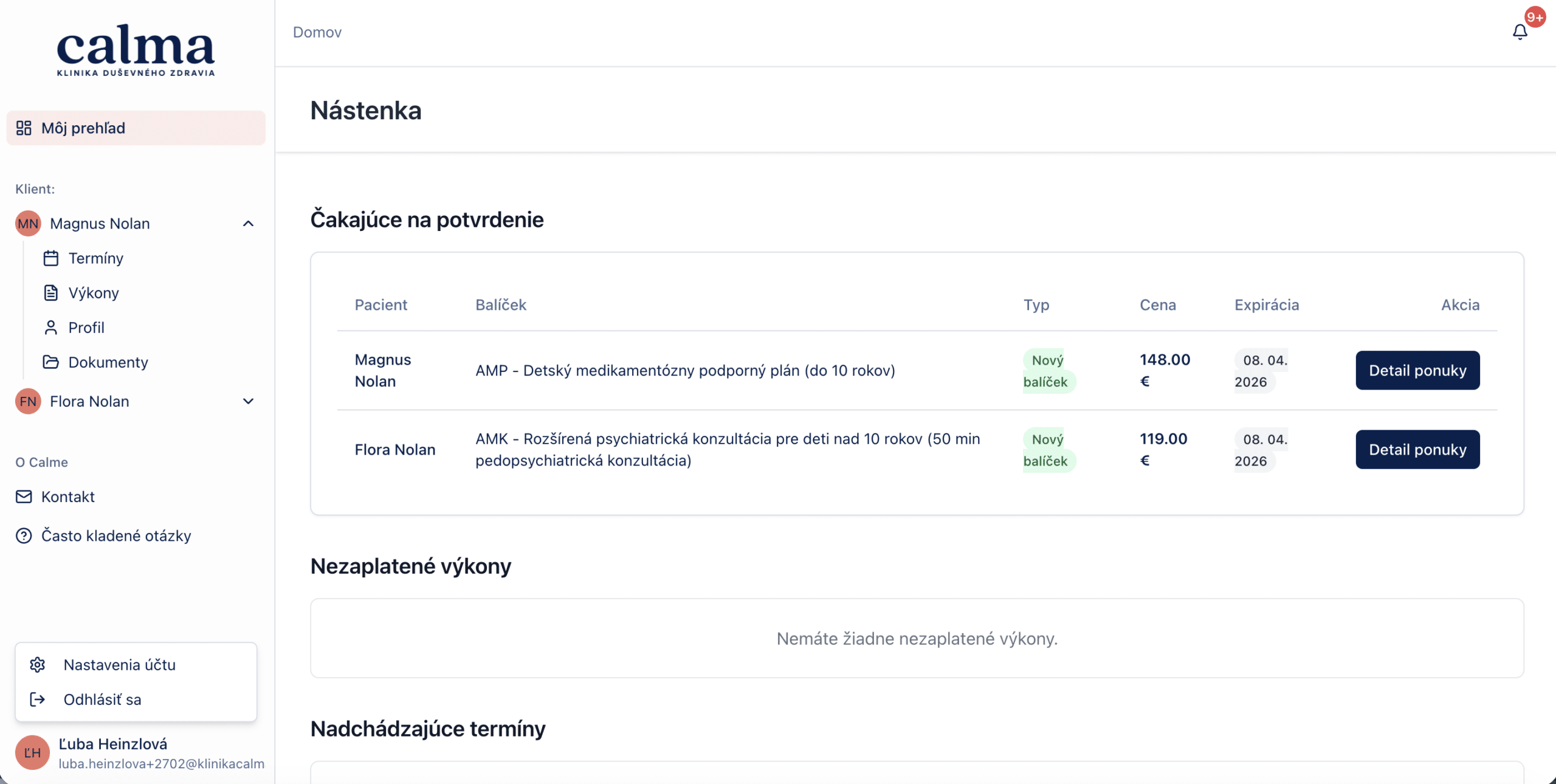 Po prihlásení do Klientskej zóny sa vám zobrazí nástenka s najdôležitejšími informáciami o vašej starostlivosti.