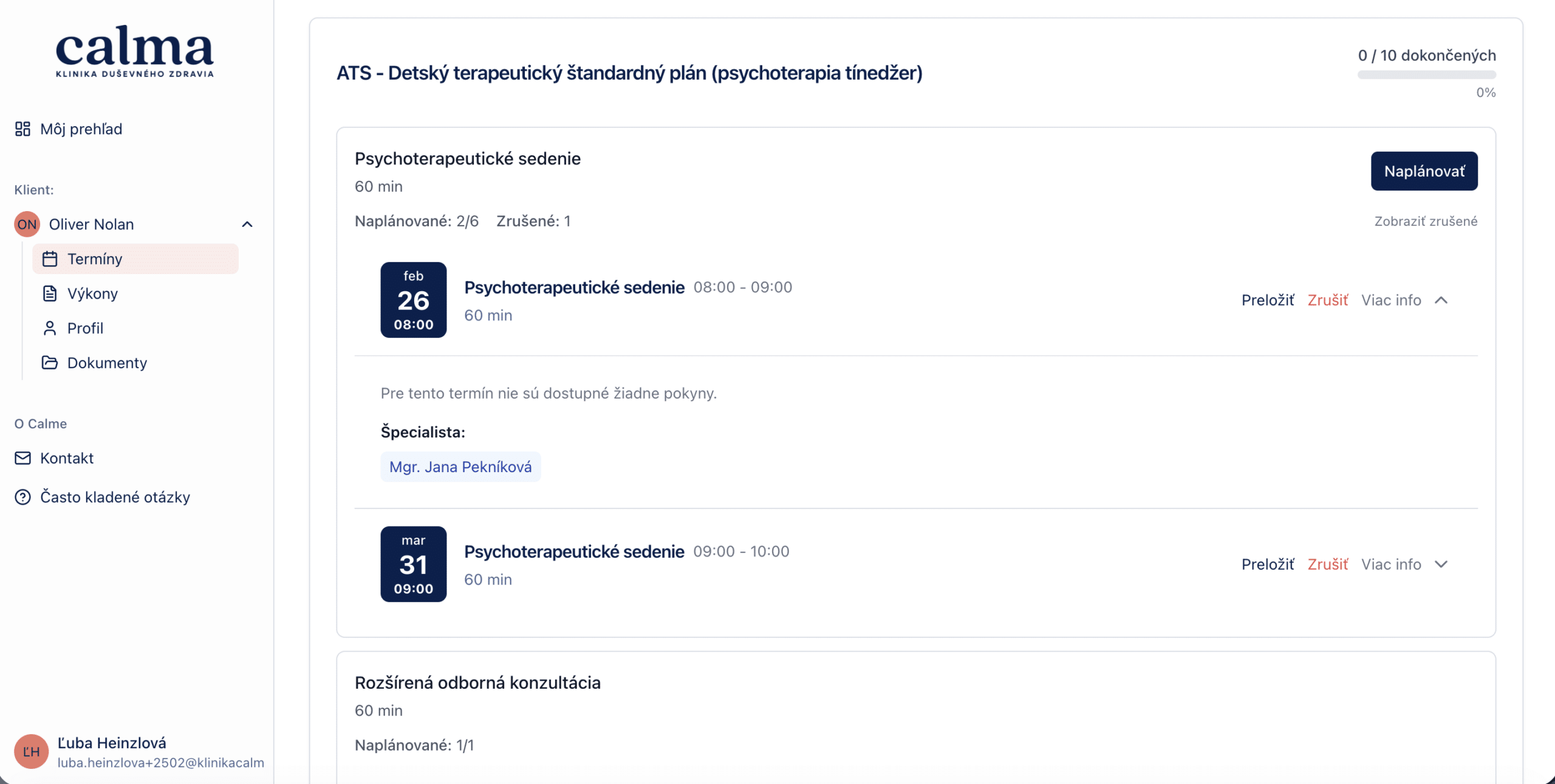 Vďaka tomu máte vždy jasný prehľad o tom, čo vás čaká, čo je už vybavené a čo je ešte potrebné urobiť. Termíny môžete priamo z Klientskej zóny naplánovať, presunúť alebo zrušiť podľa dostupných možností.