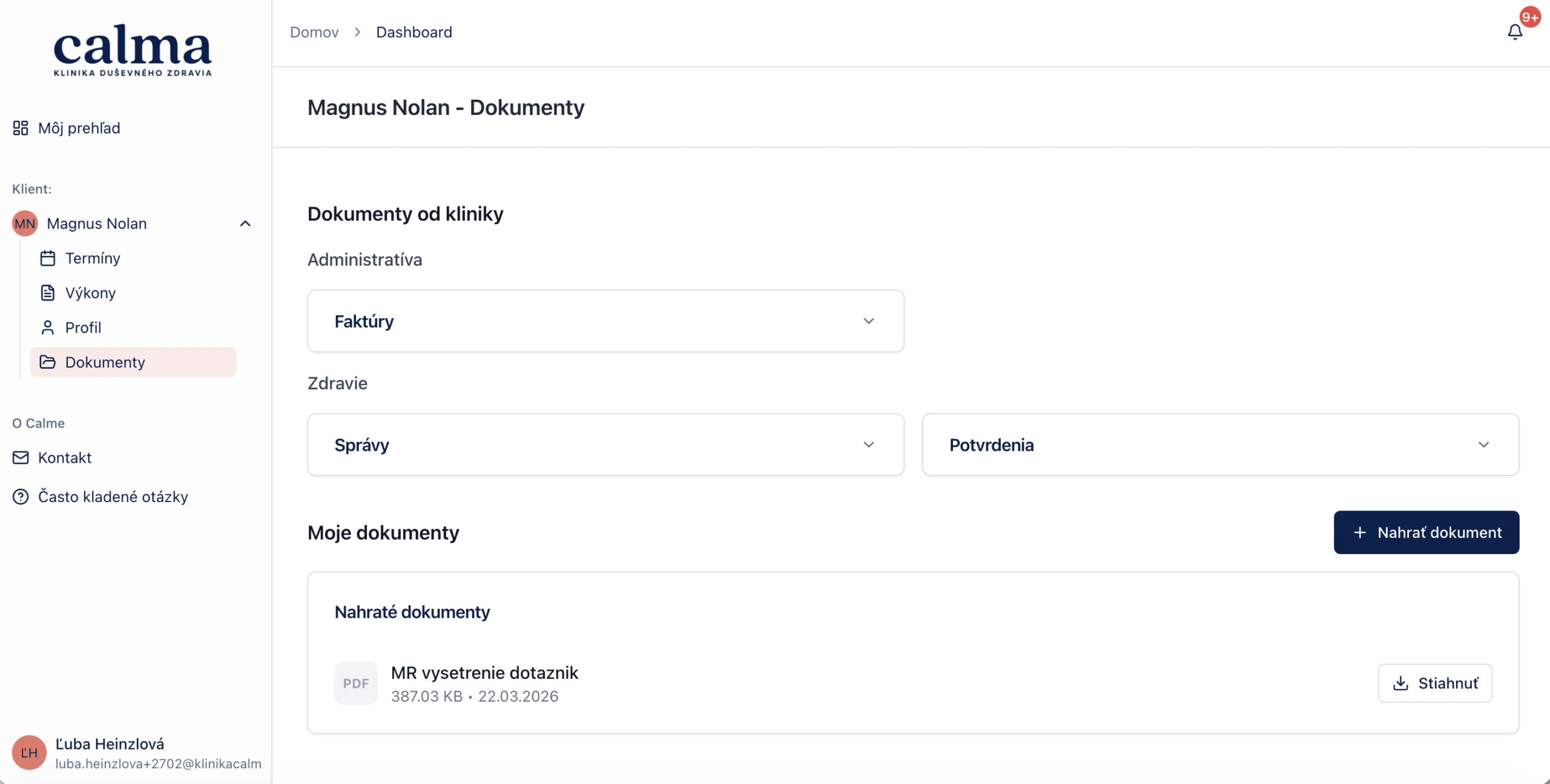 V Klientskej zóne máte vždy k dispozícii všetky dokumenty súvisiace s vašou starostlivosťou v Calme. Nájdete tu administratívne dokumenty, ako sú zmluvy, objednávky či faktúry, aj odborné správy a potvrdenia od našich odborníkov.