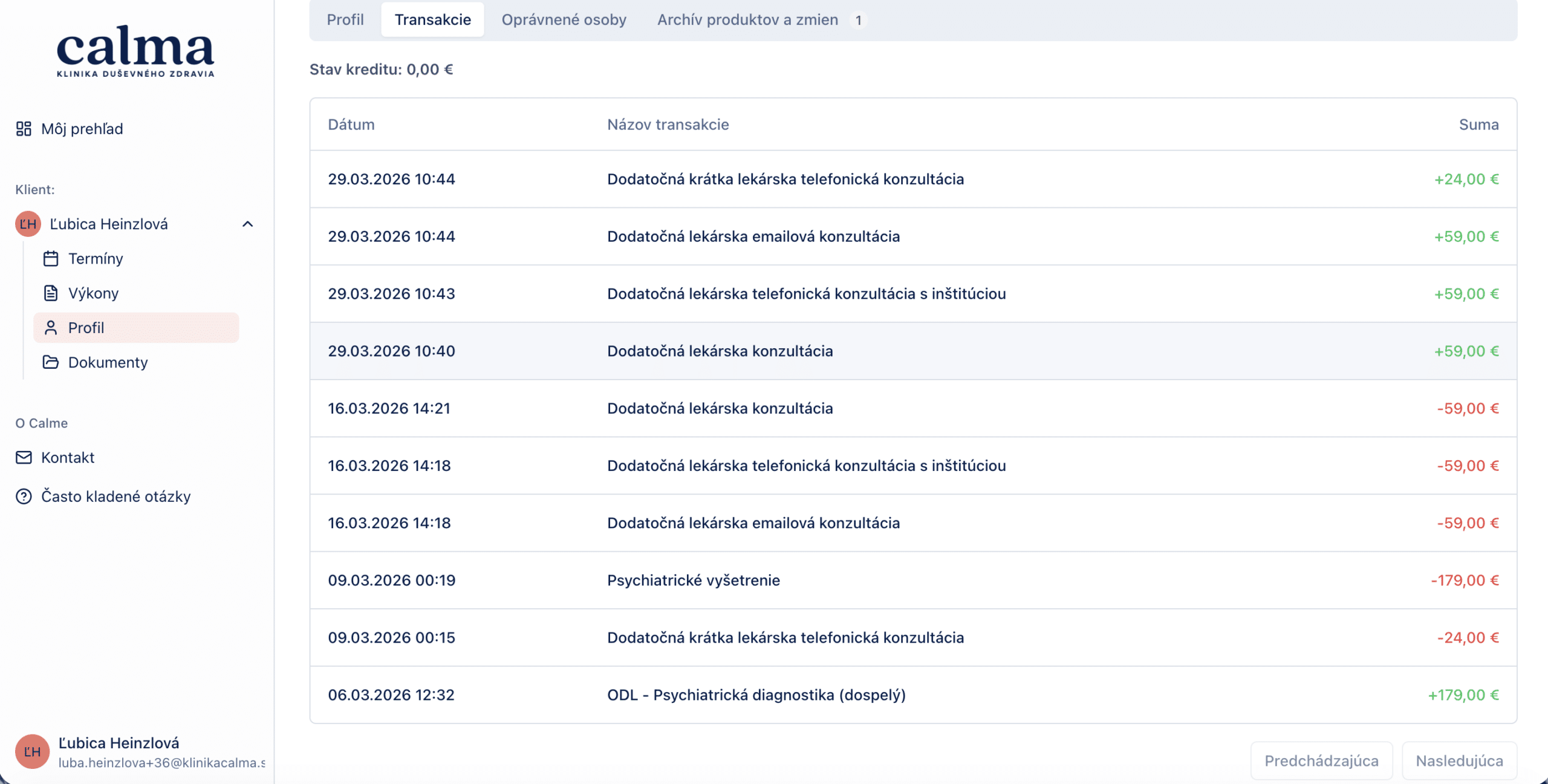 V Klientskej zóne máte kedykoľvek k dispozícii prehľad všetkých platieb a finančných pohybov spojených s vašou starostlivosťou. Vidíte aktuálny stav kreditu, z ktorého sa uhrádzajú jednotlivé výkony a služby.